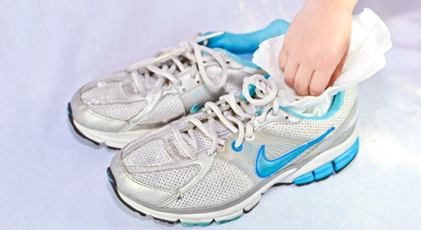 После окончания стирки, кроссовки надо набить белой скомканной бумагой. Газеты и любые другие листочки, прошедшие через типографию, не подойдут. Краска слиняет и отпечатается на обуви. Можно в качестве промокашек использовать белые бумажные полотенца, салфетки или...туалетную бумагу.