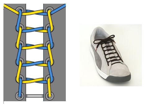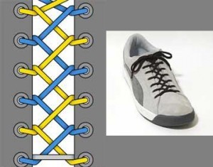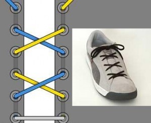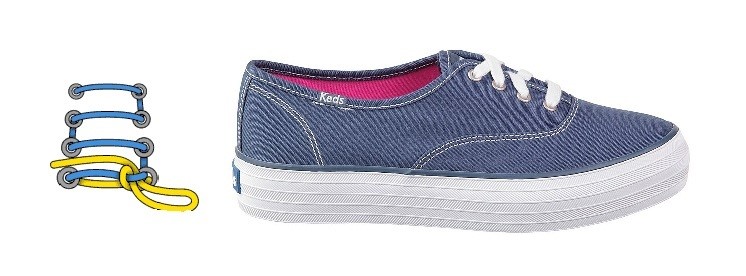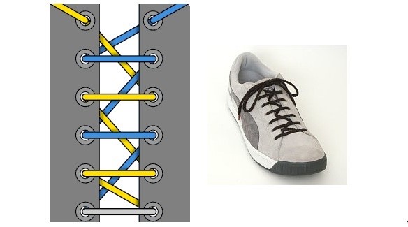 Способ прижился в Европе. В отличие от «зигзага» шнуровка производиться снаружи вовнутрь. При этом одна сторона продевается через дырочки в первом и втором ряду, а потом через ряд, в то время как вторая сторона продевается сразу через ряд. Шнуровка продолжается до конца и сторона, которая продевалась сразу через ряд на предпоследнем и последнем ряду продевается без пропуска. Сначала способ может показаться несколько запутанным, но приноровившись, его вязка уже не занимает много времени. Выглядит узор стильно и аккуратно.